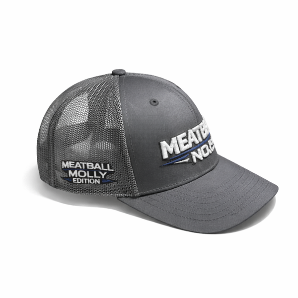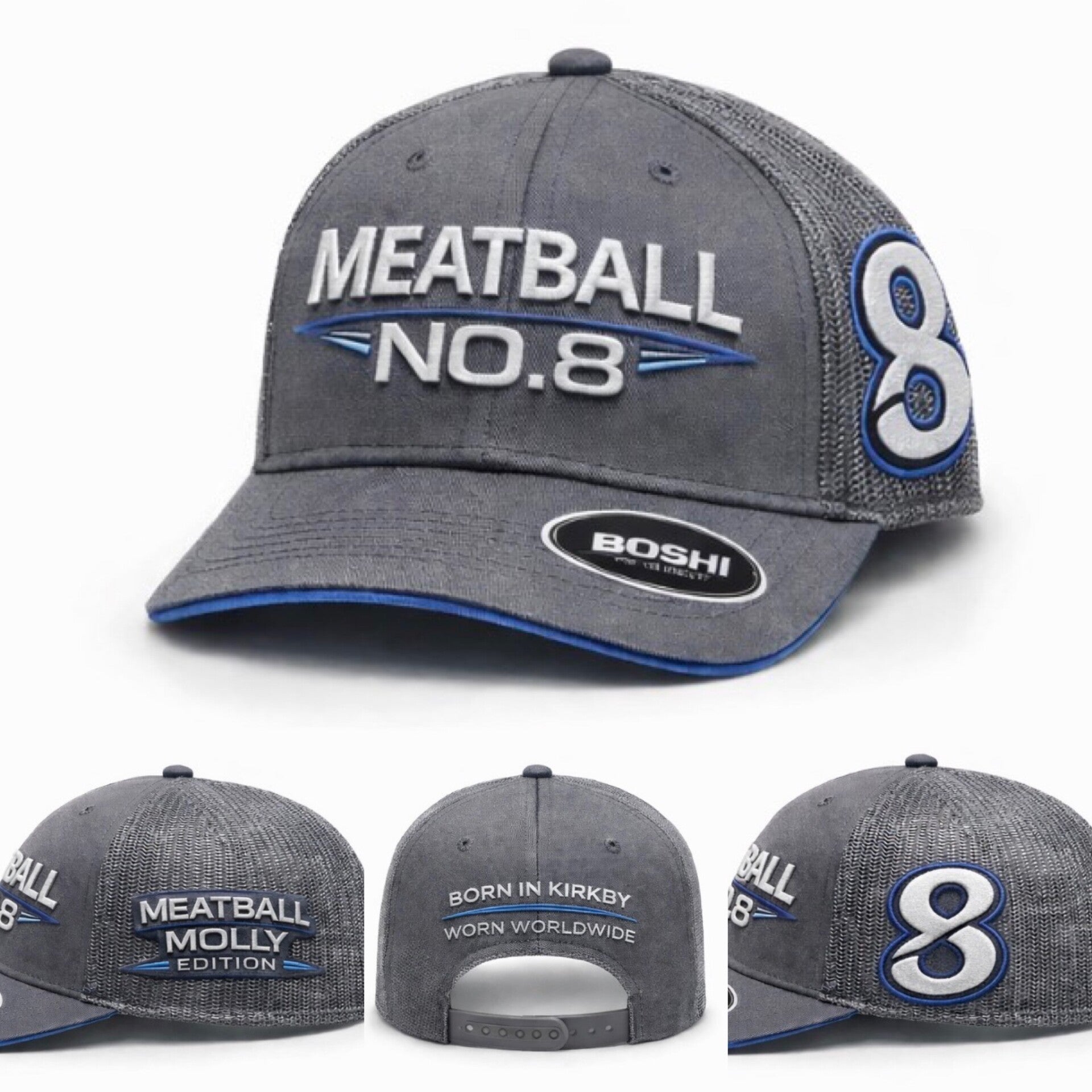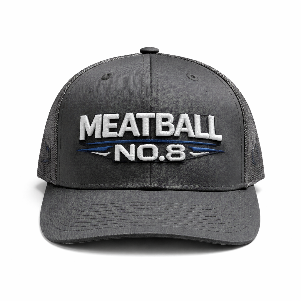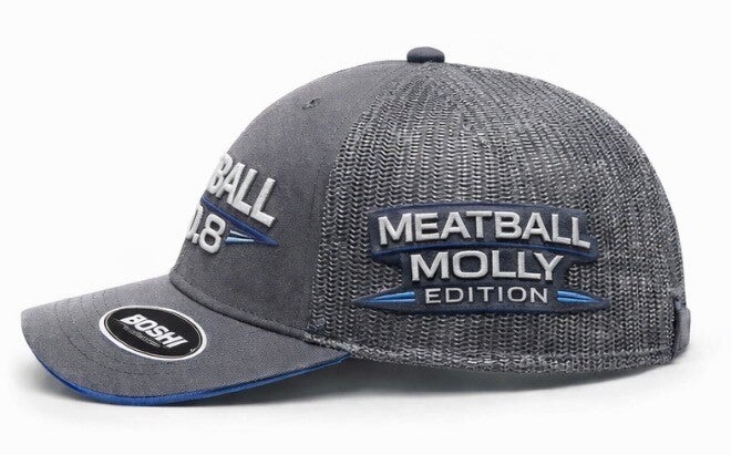 Designed in a striking steel grey crown with electric blue detailing, this cap features bold 3D embroidered “MEATBALL NO.8” branding across the front and the signature No.8 patch on the mesh side panel. The opposite side proudly carries “Meatball Molly Edition”, marking this as one of the most exclusive drops we’ve ever released.