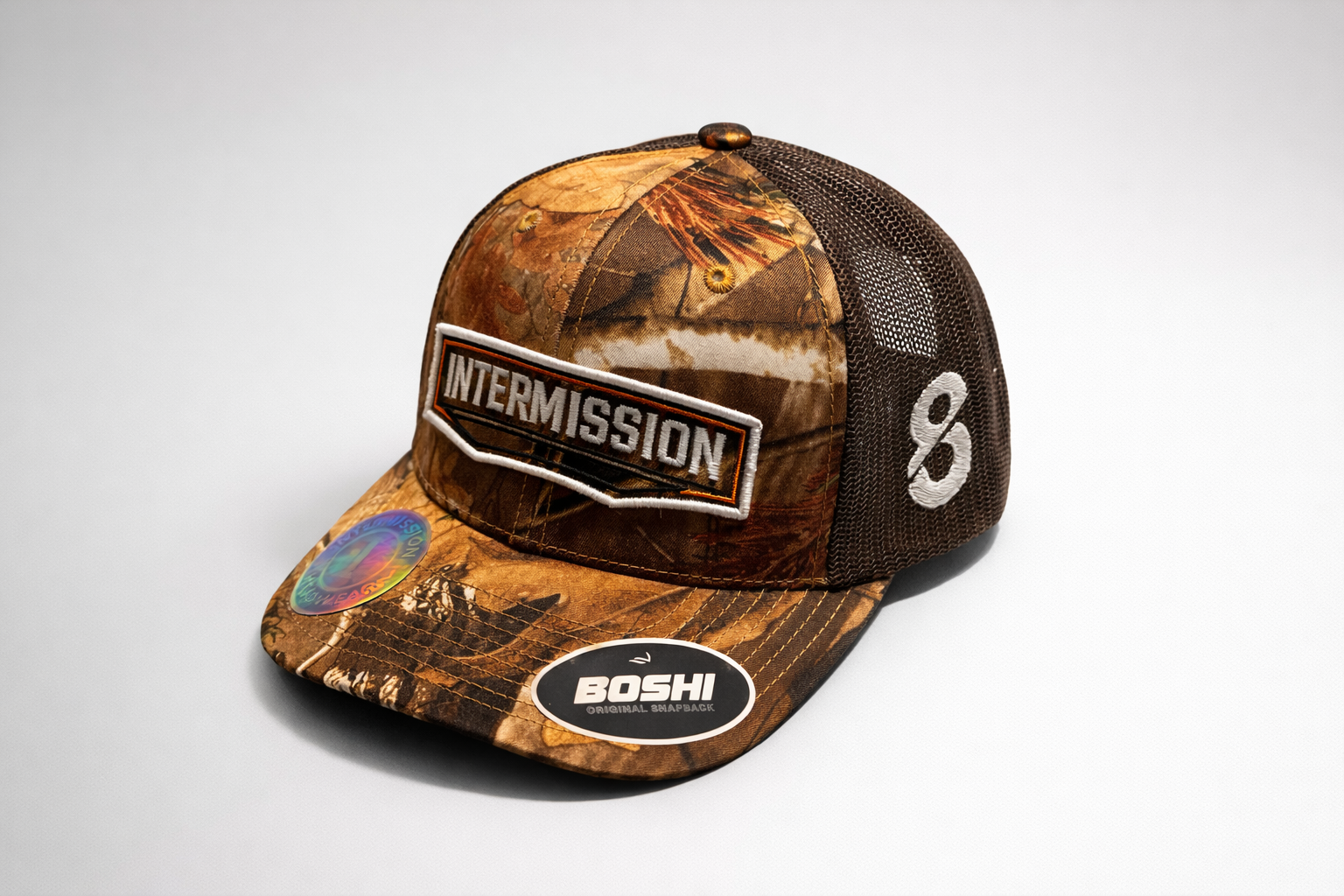 Crafted with a detailed woodland camo front, breathable mesh rear panels, and our signature INTERMISSION embroidered patch, it’s finished with the iconic No.8 on the side a symbol of the journey, the graft, and where it all started.